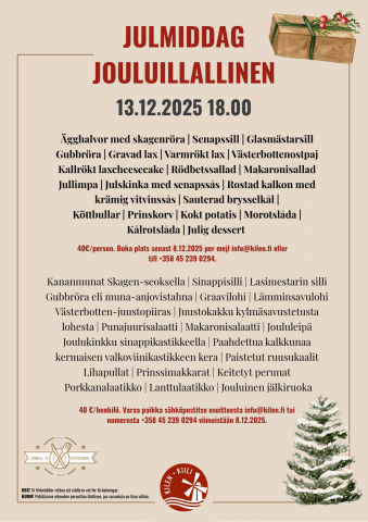 På lördag 13.12 kl 18.00 dukas ett traditionellt julbord upp i restaurangen tillsammans med vår samarbetspartner Oneils Kitchen. Endast förhandsbokning. Boka plats senast 8.12 per mejl info@kilen.fi eller tel 045 239 0294 (Harriet). Vi förbehåller oss rätten att ställa in vid för få förhandsbokningar. Pris: 40€/vuxen.